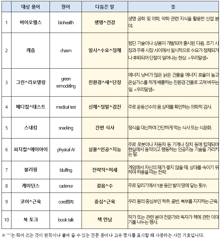 문화체육관광부(장관 최휘영, 이하 문체부)와 국립국어원(이하 국어원)은 최근 언론 등에서 사용하고 있지만 일반 국민들이 정확한 의미를 이해하기 어려운 외래 용어 10개를 선정해 알기 쉬운 우리말로 다듬었다.